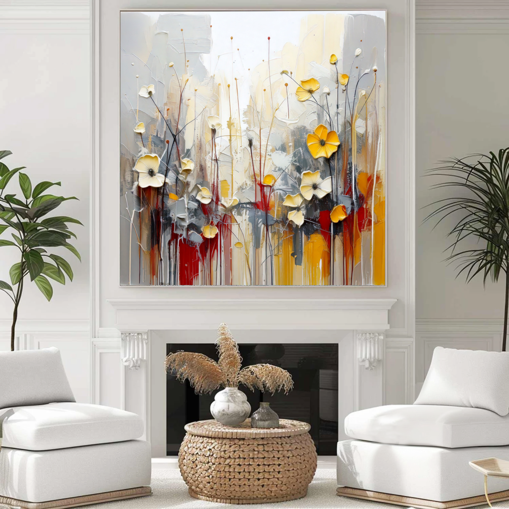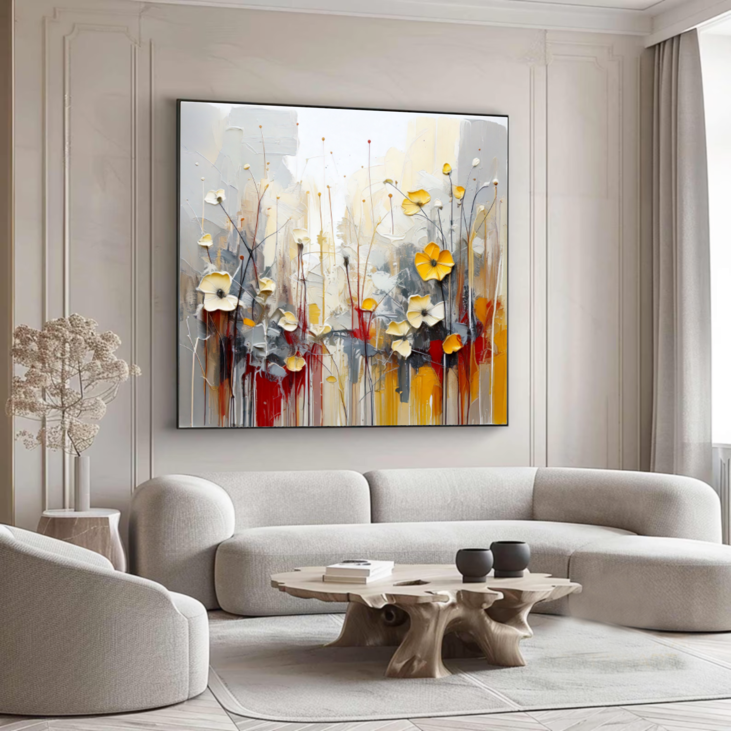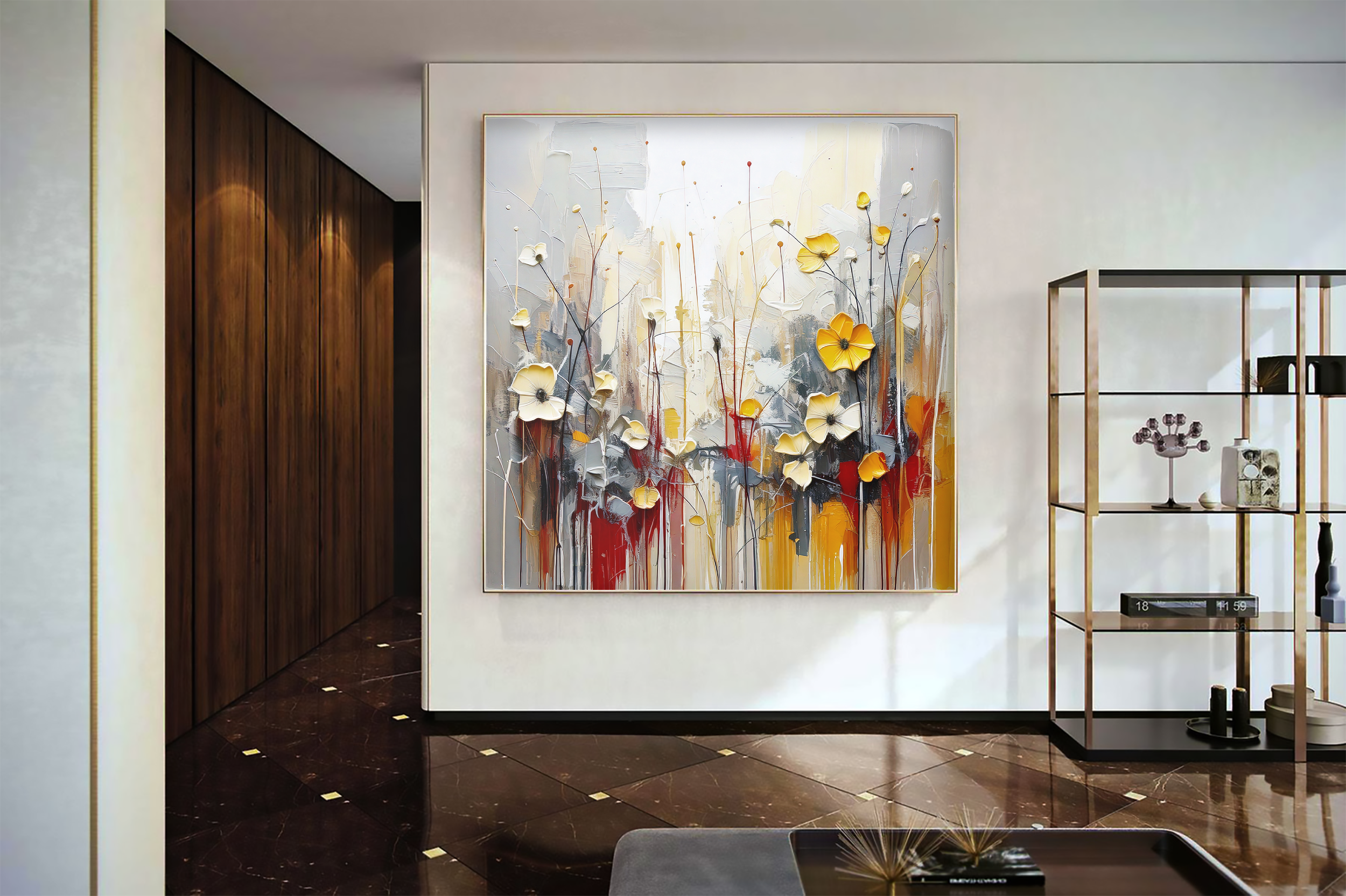 This colorful floral artwork captures the perfect balance between modern abstract art and natural floral charm, making it an ideal centerpiece for a variety of spaces. Whether you're decorating a modern home interior, cozy living room, sophisticated office, stylish kitchen, or welcoming hallway, this painting is designed to complement and elevate any environment.