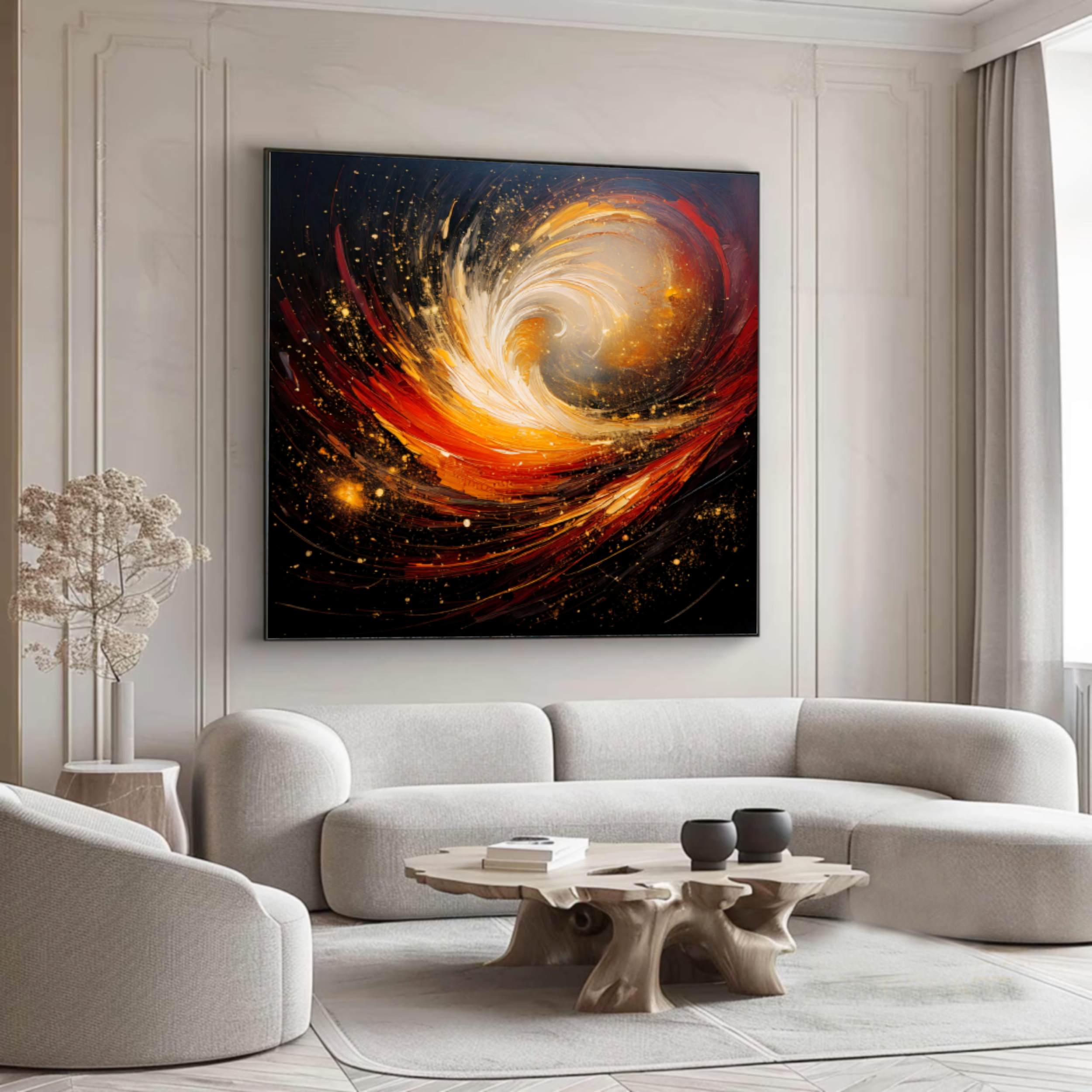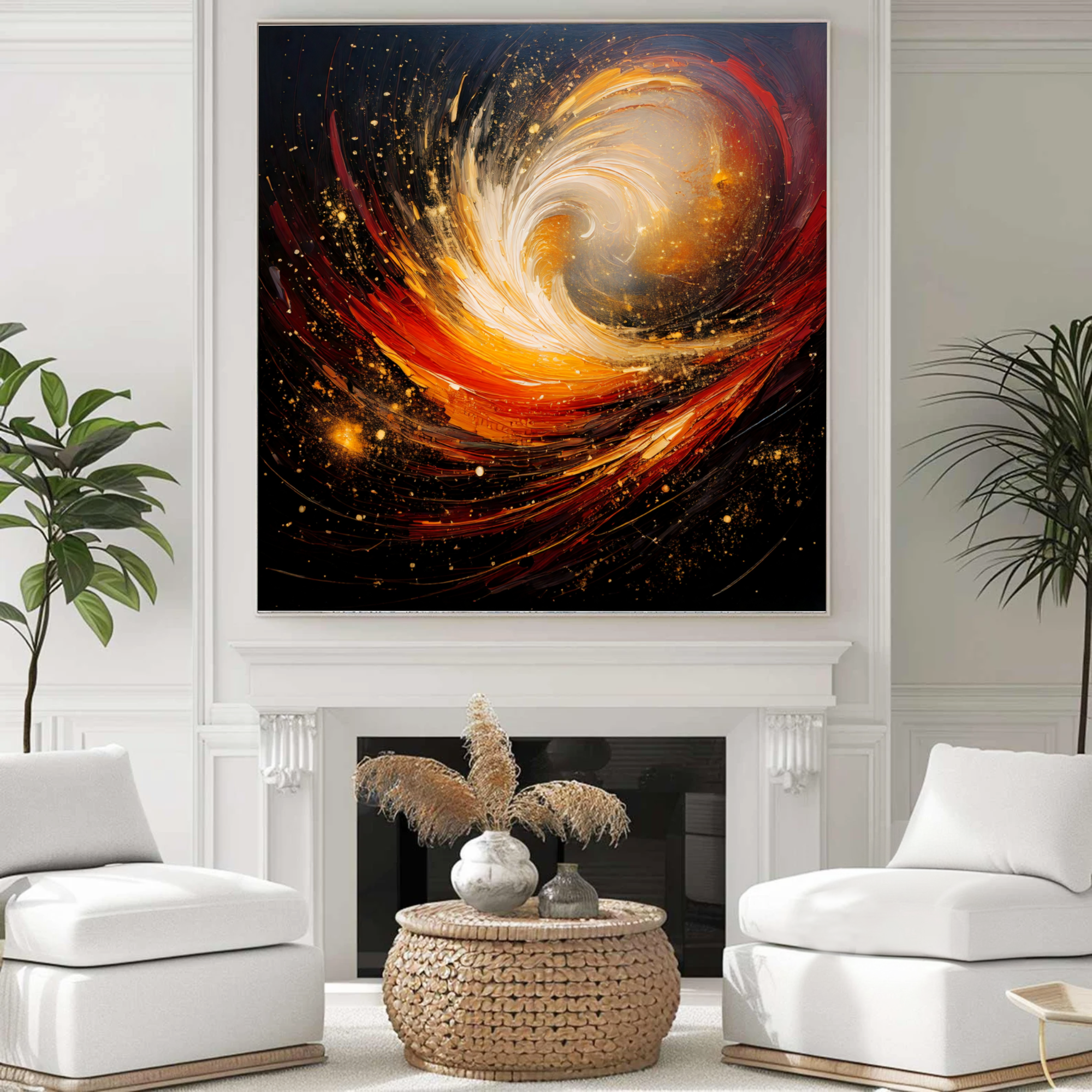 Crafted with extraordinary attention to detail, every brushstroke in Celestial Inferno bursts with movement and emotion, capturing the swirling dance of cosmic fire and golden light. The bold palette of deep crimson, fiery orange, radiant gold, and soft ivory against a dramatic black backdrop creates an intense visual statement that elevates any interior.