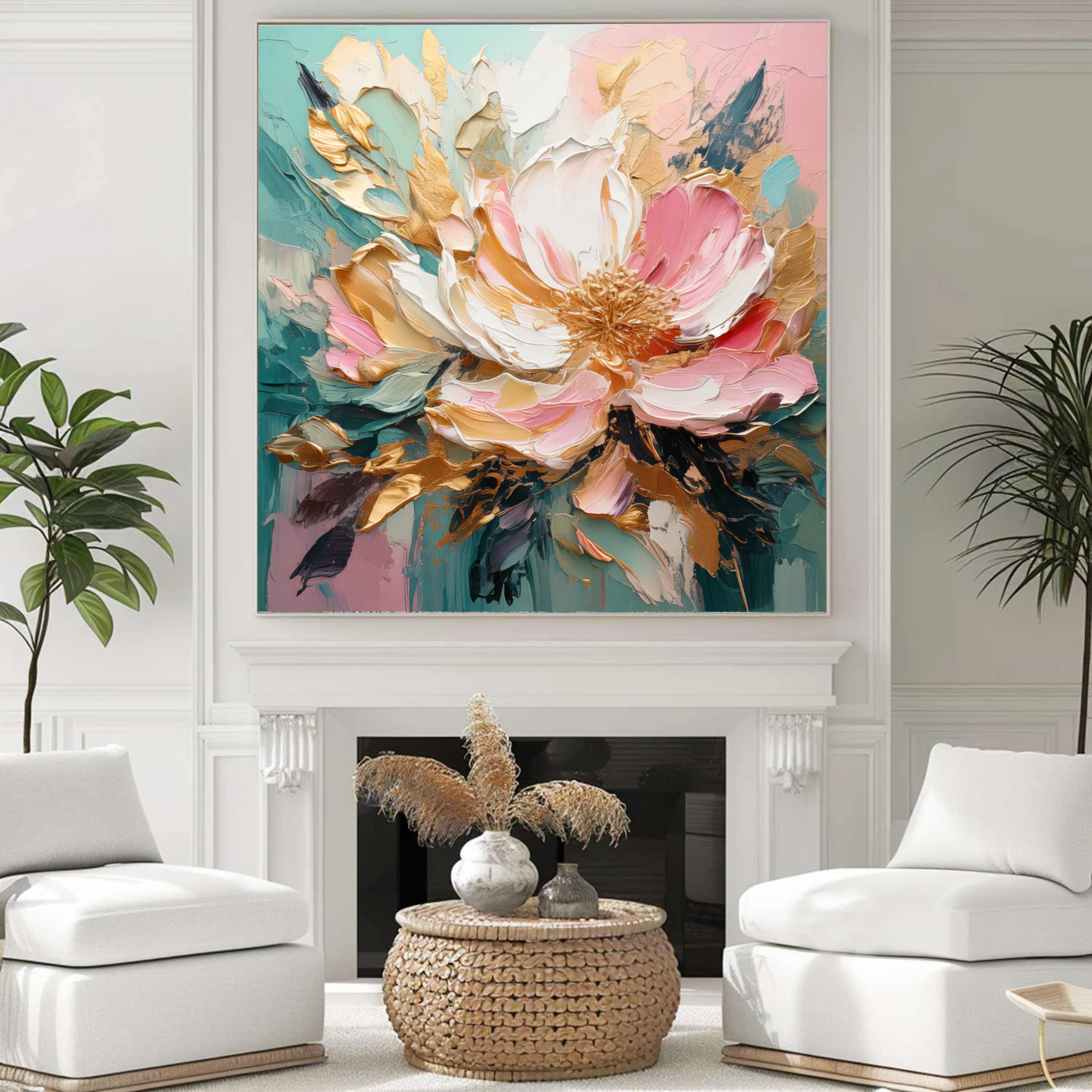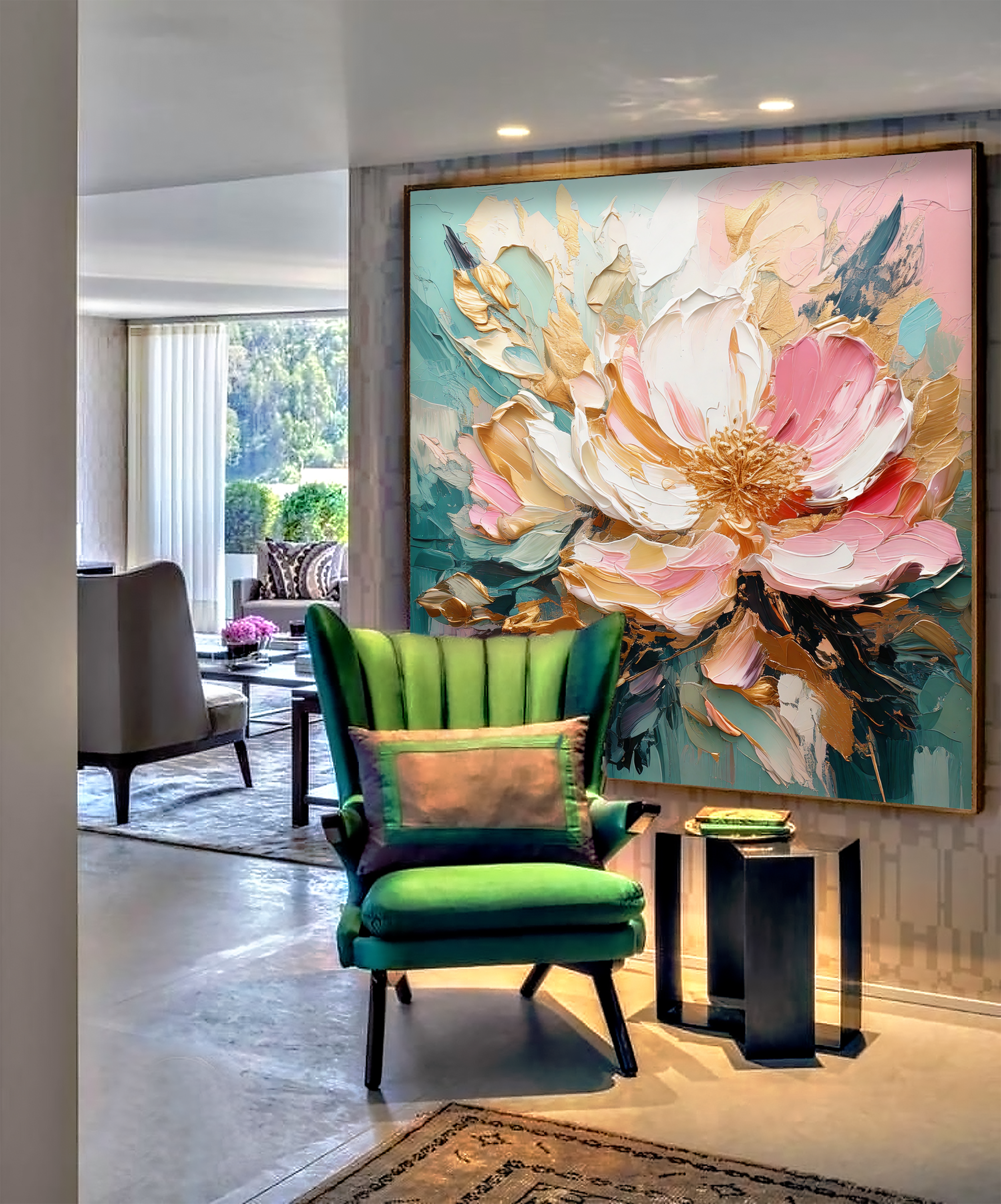 This museum-quality painting is made with premium oil paints on high-grade canvas, reflecting texture, depth, and vibrant color that can’t be replicated by mass-produced prints. The floral abstraction exudes elegance and calm, making it a perfect statement piece for modern interiors, cozy bedrooms, or sophisticated entryways.
