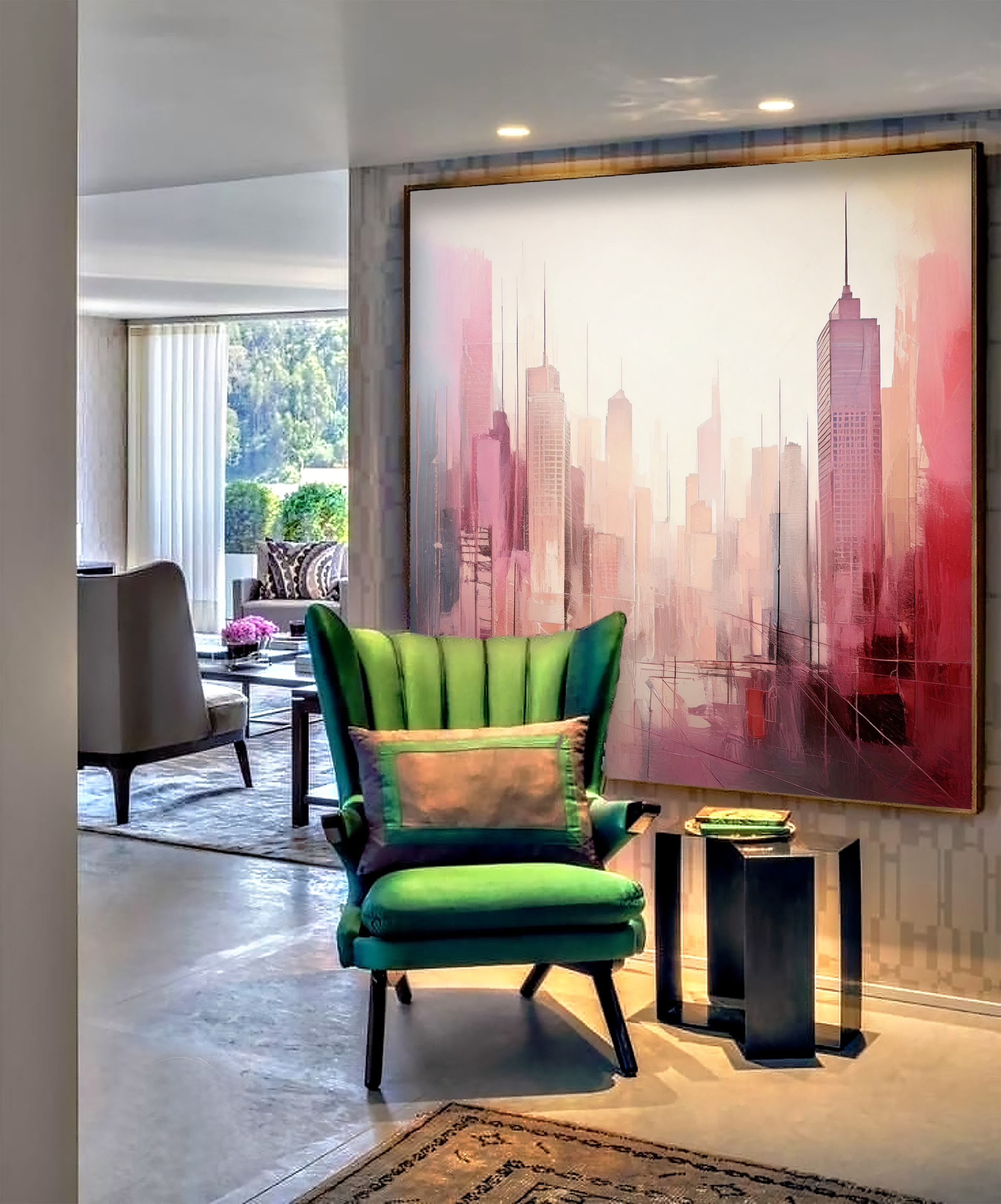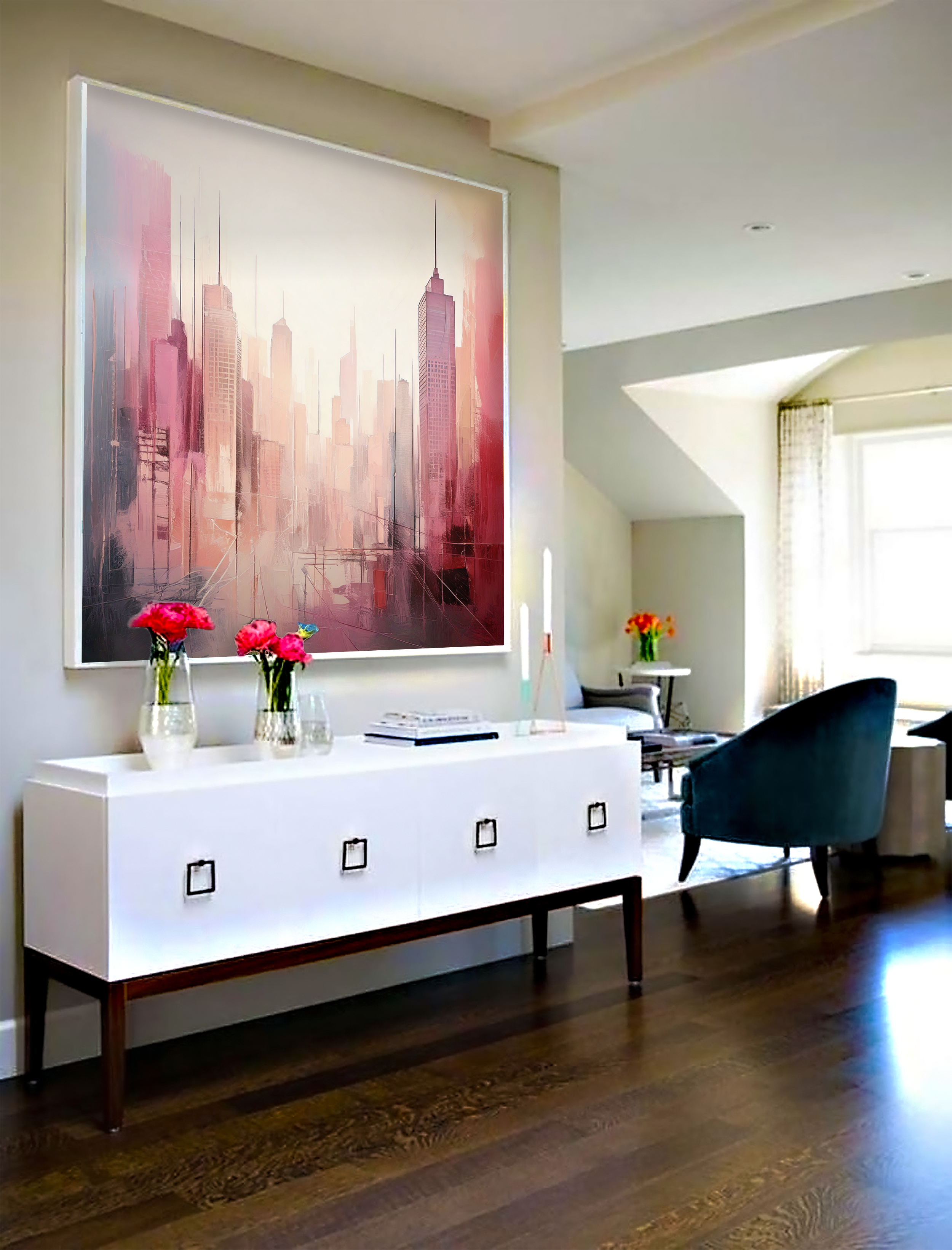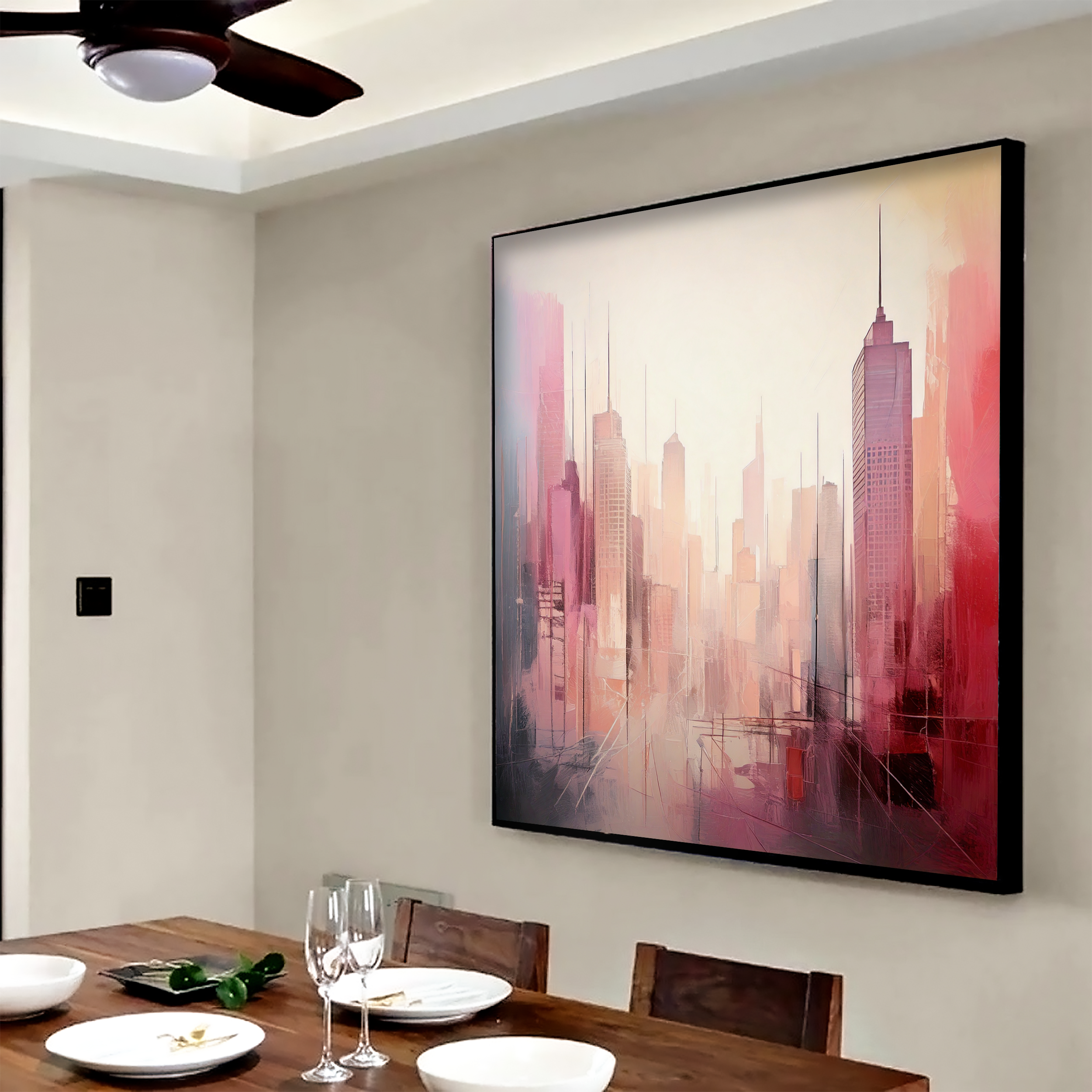 This museum-quality painting is a perfect match for luxury interiors, modern lofts, executive offices, upscale residences, and elegant commercial settings. Whether you're decorating your living room, dining area, boardroom, or boutique hotel, "Crimson Skyline – Urban Dreams at Dusk" will elevate your décor with its stylish aesthetic and contemporary soul.