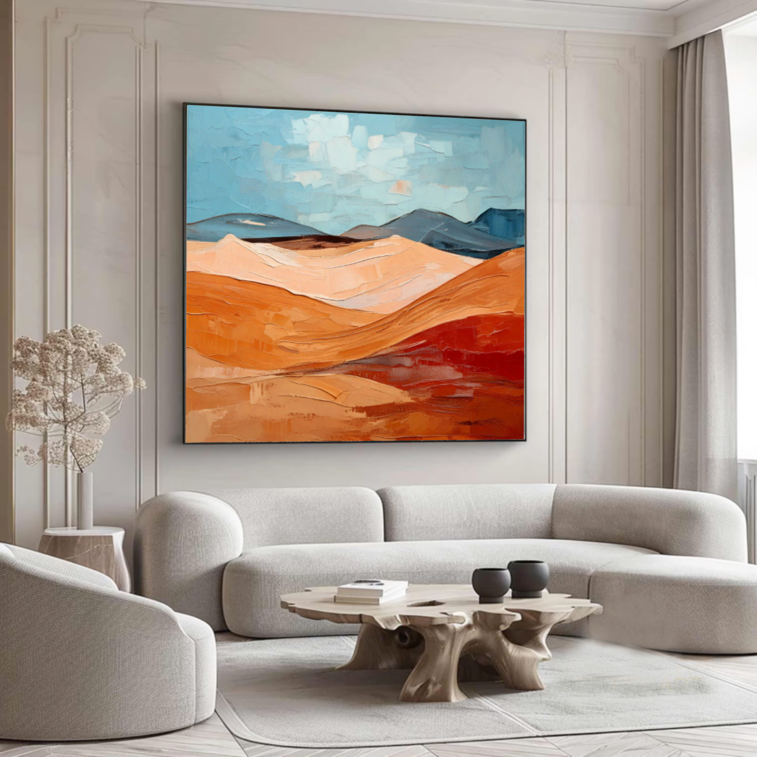 The warm earthy tones and textured strokes of Desert Serenity are designed to complement a wide range of interiors. Whether you're decorating a modern living room, sophisticated office, cozy lounge, high-end hotel suite, or boutique commercial space — this painting effortlessly enhances your surroundings with an air of artistic elegance.