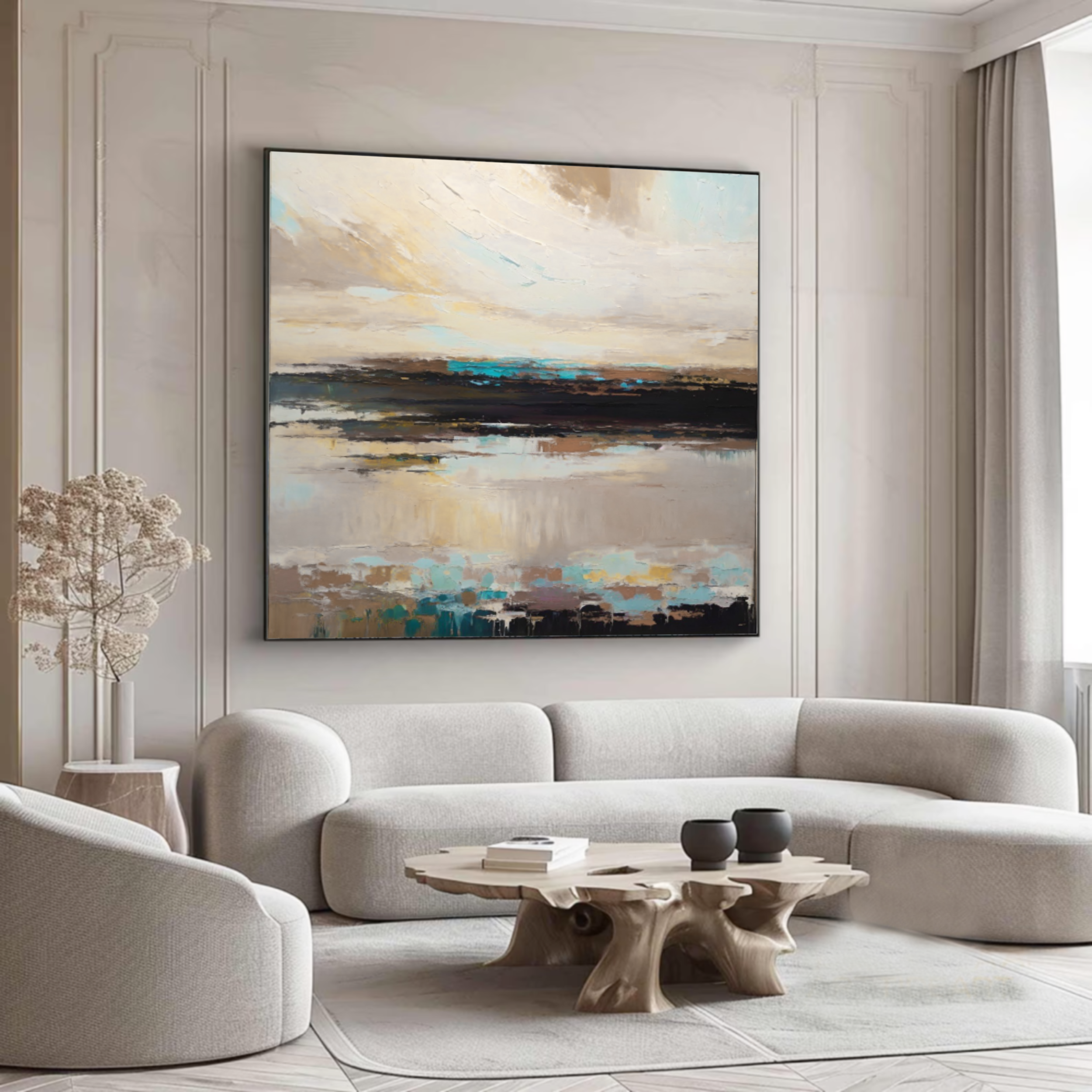 Transform your living space with Golden Reflections, a captivating abstract landscape that beautifully captures the calm and depth of nature's transitions. This square canvas features a masterful blend of earthy neutrals, soft sky tones, and vivid turquoise highlights, creating the illusion of a reflective lake or tranquil shoreline at sunset.