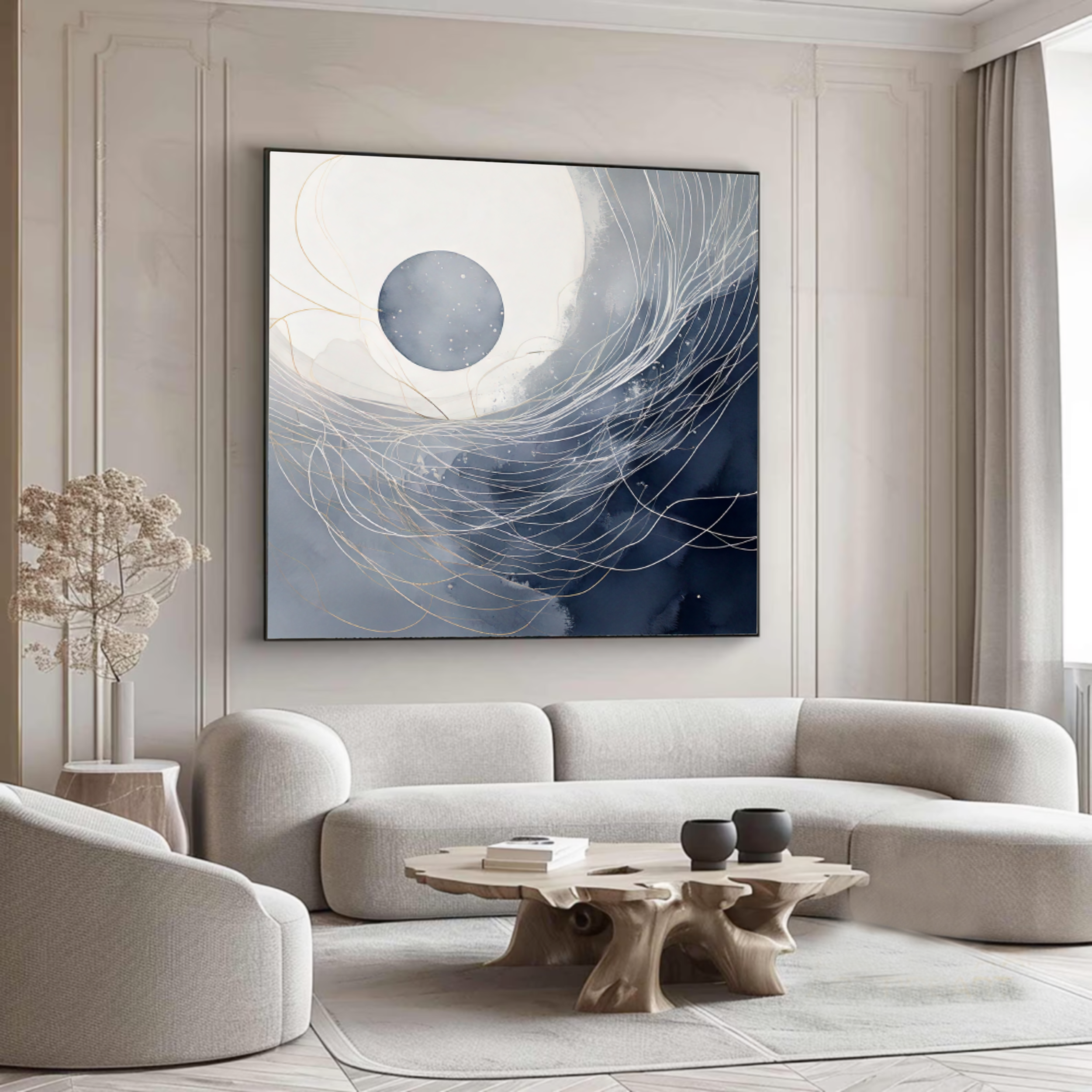 The painting’s balanced tones of navy blue, ivory white, and delicate gold-like linework make it a versatile choice for both cozy and grand interiors, creating an atmosphere of calm and understated opulence.
