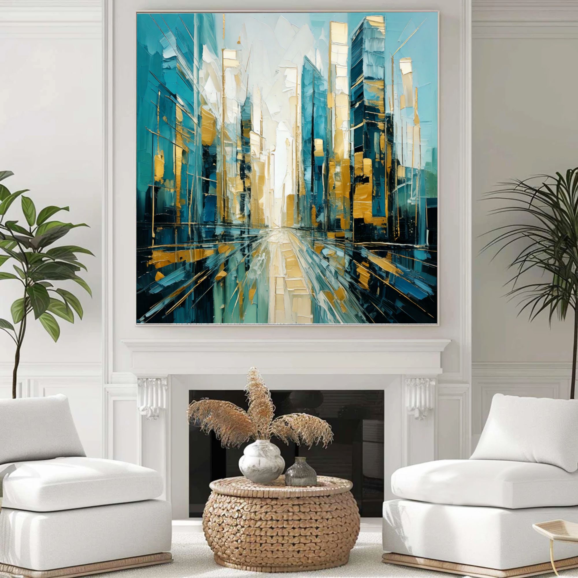 Bring the energy of a glowing city skyline into your space with Midnight Metropolis — a handcrafted oil painting that captures the spirit of modern architecture, motion, and luxury. With a deep, elegant palette of sapphire blue, rich gold, and icy neutrals, this artwork radiates depth and sophistication. It’s a bold yet timeless addition to any contemporary interior.