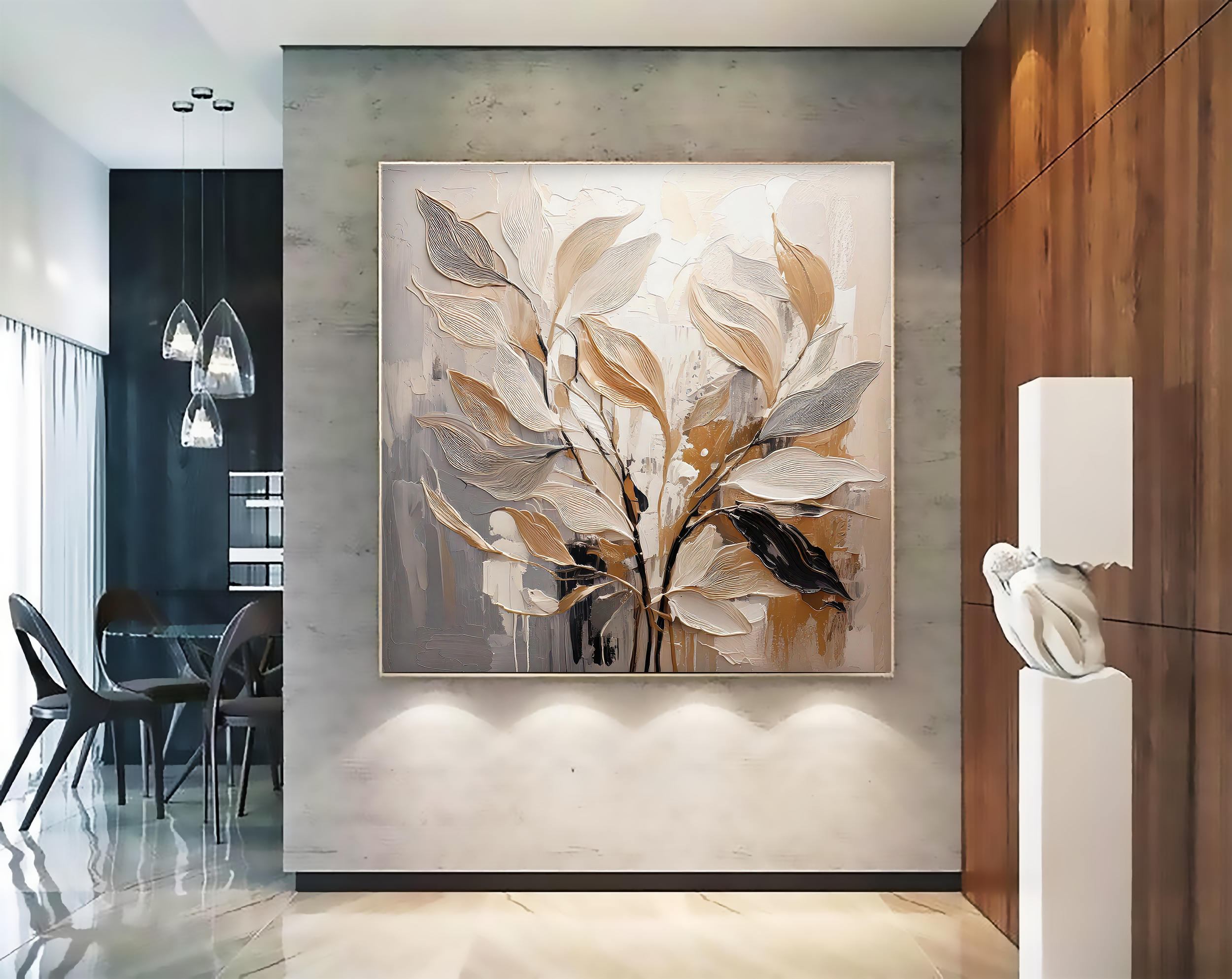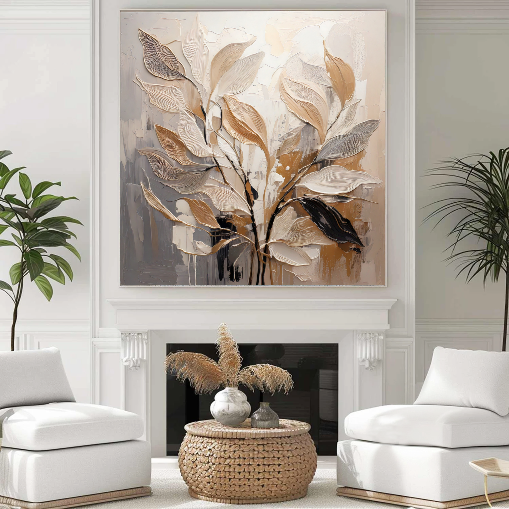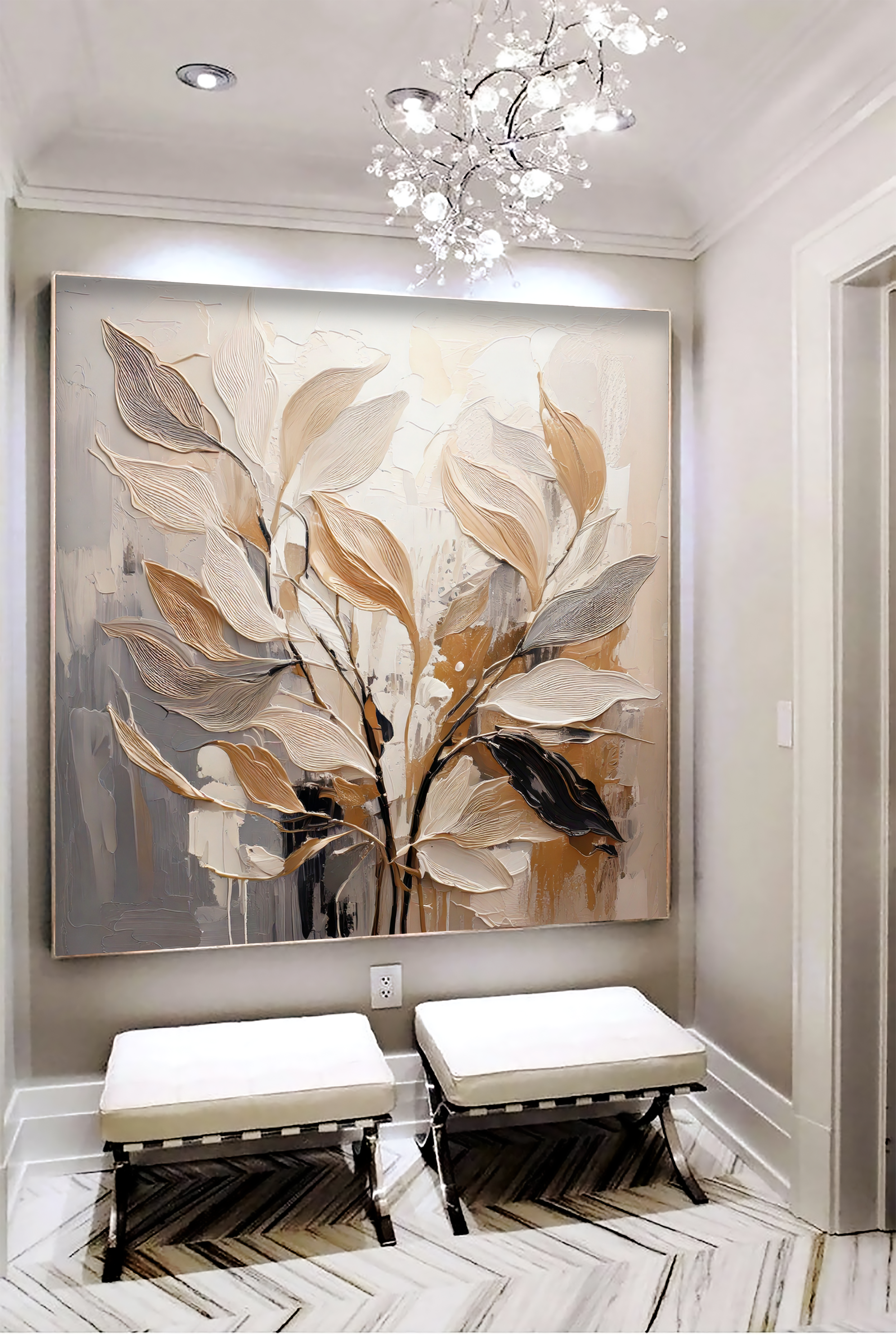 Introduce calm elegance and natural beauty to your space with this 100% handmade textured abstract oil painting. Inspired by the gentle flow of leaves and the earthy charm of nature, this piece combines soft neutral tones with intricate 3D textures, creating a harmonious blend of art and tranquility.
