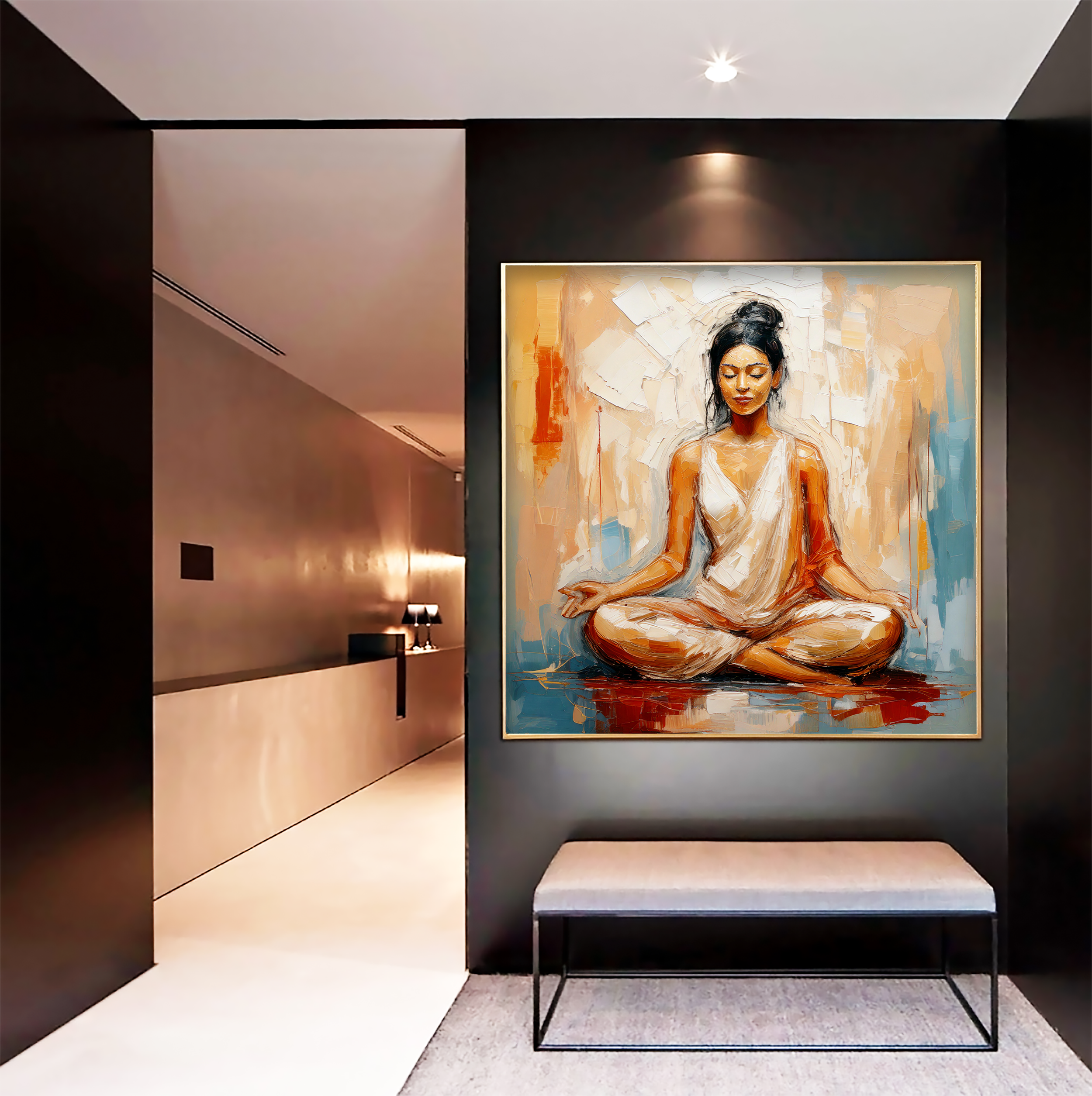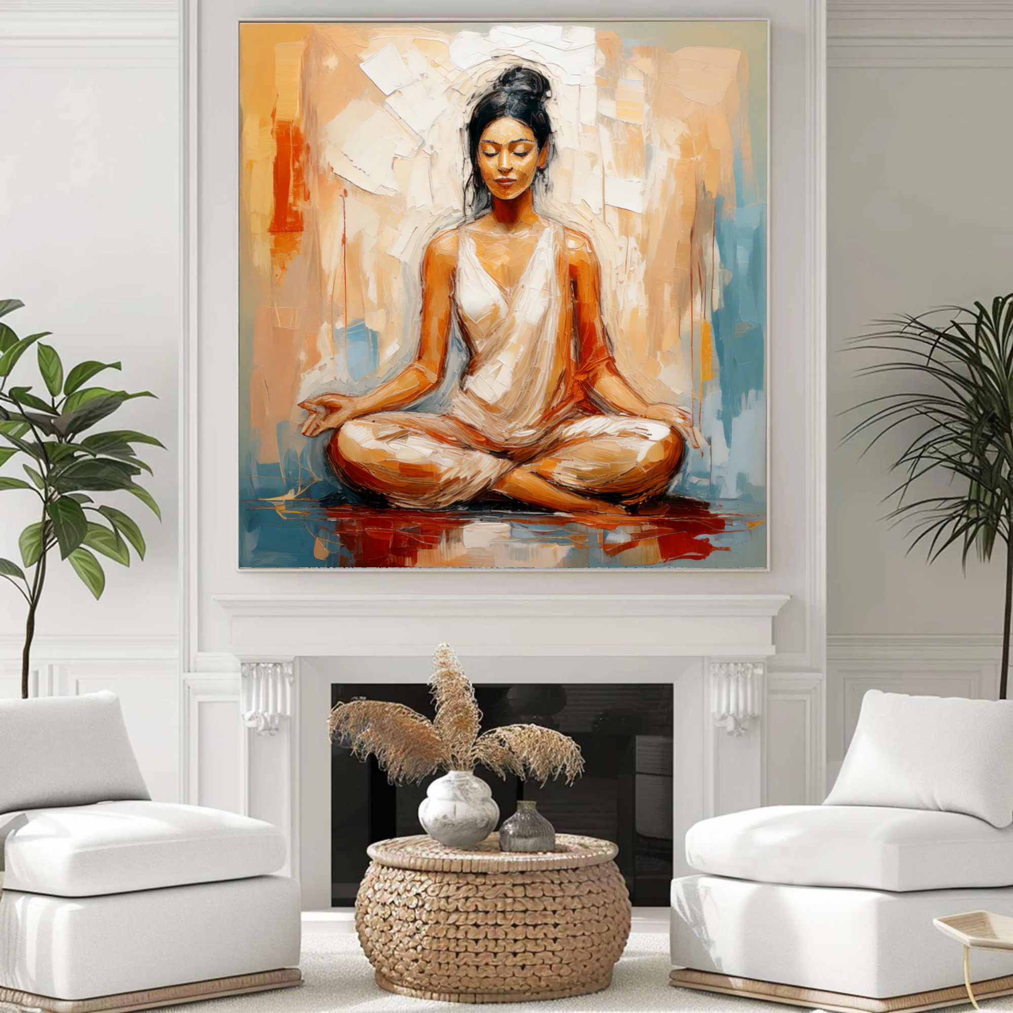 Embrace serenity and soulful presence with “Tranquil Grace”, a striking original oil painting that captures a moment of perfect stillness and inner peace. This handmade artwork portrays a poised female figure seated in meditative lotus position, eyes closed in calm focus, radiating a powerful yet gentle energy. Wrapped in warm tones of terracotta, beige, and ivory, accented with subtle strokes of turquoise and earthy reds, the composition evokes both grounding and transcendence.
