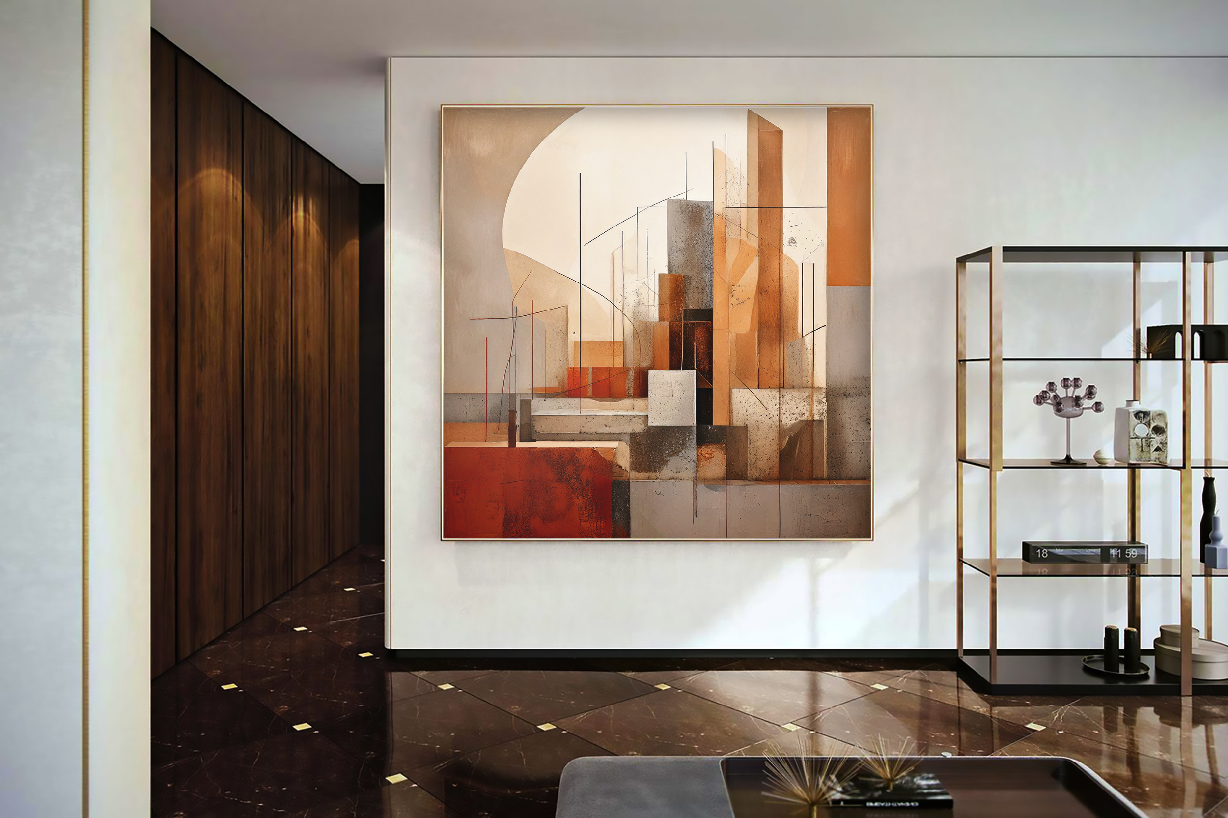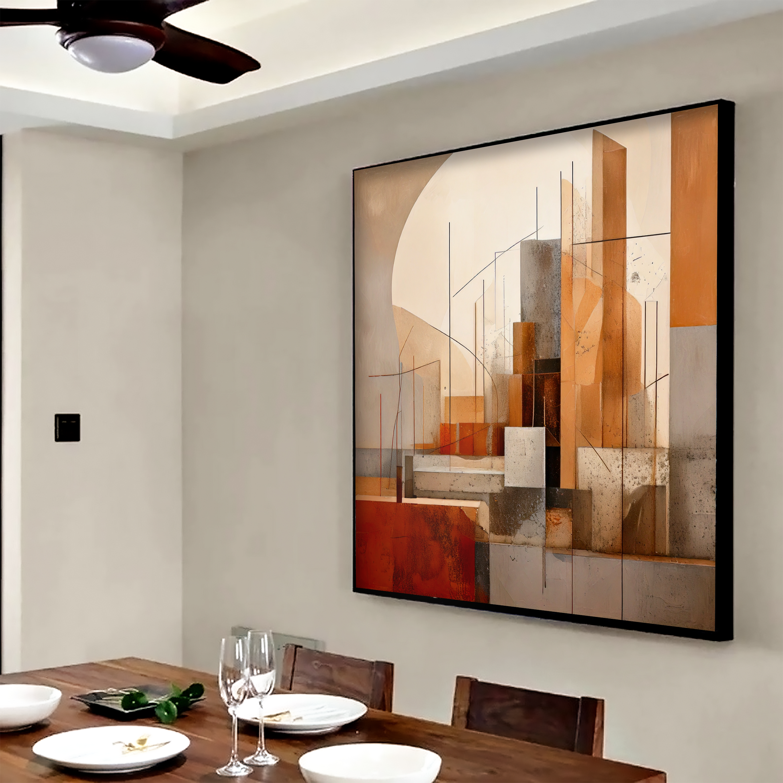 With its rich palette and abstract structure, "Urban Dusk" is a perfect fit for a variety of interior settings—including luxury apartments, contemporary living rooms, upscale offices, hallways, and gallery-style home decor. It adds warmth, character, and an intellectual edge to any environment.