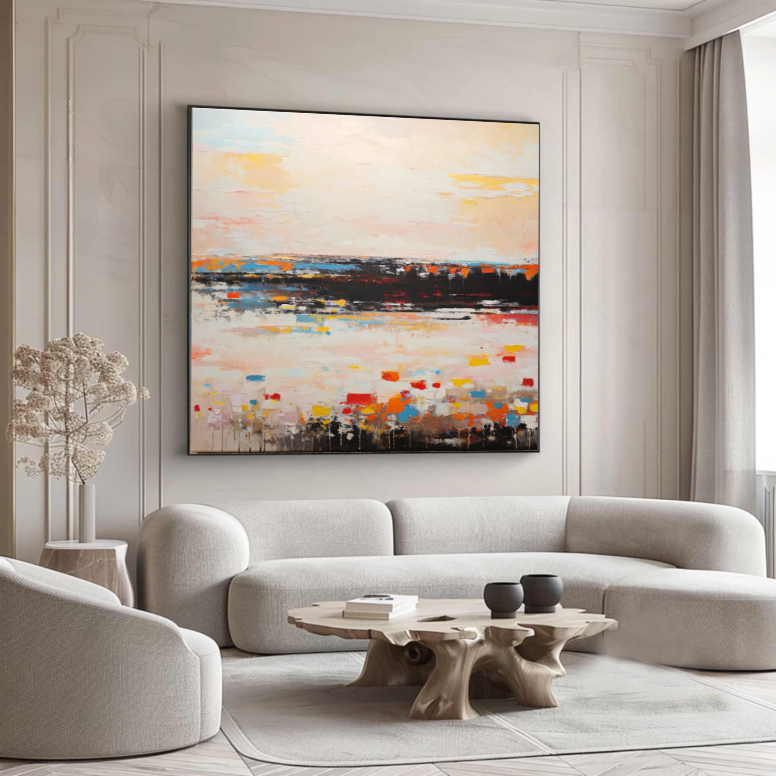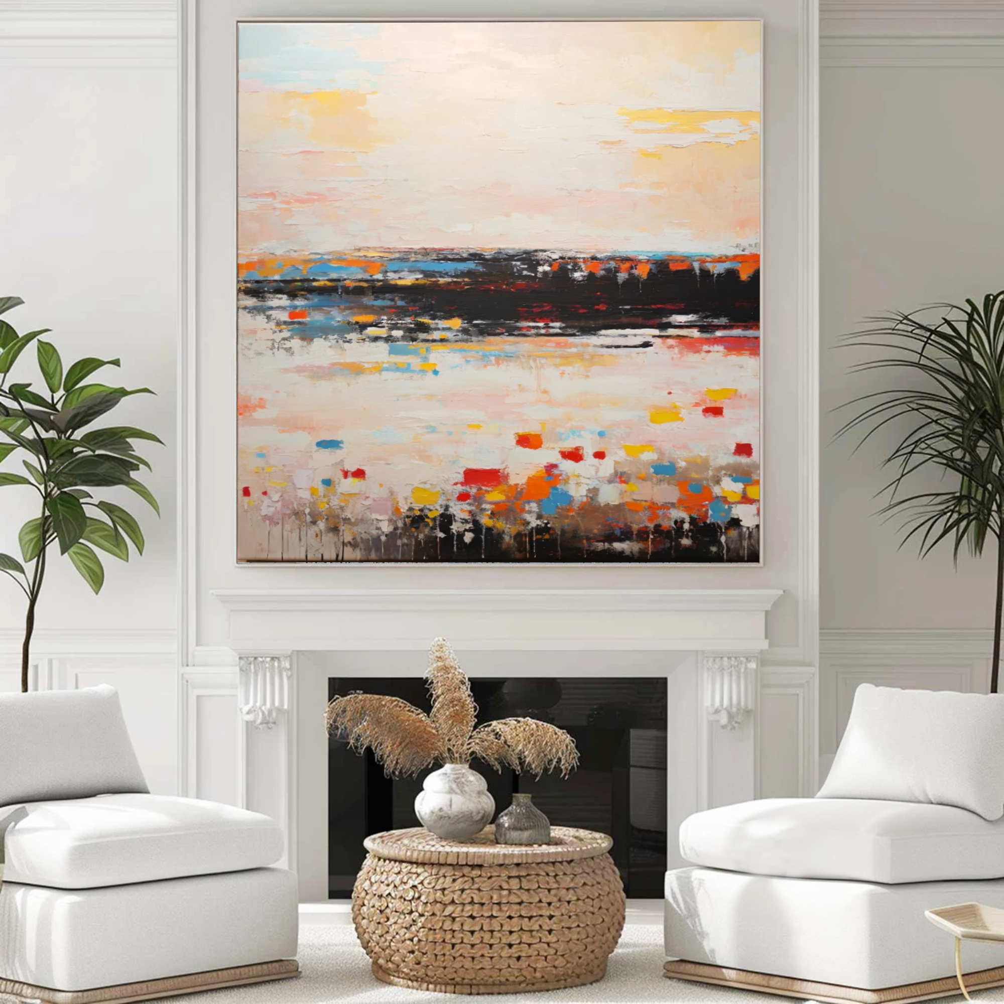 Transform your interior with the captivating beauty of this handmade abstract oil painting, where vivid colors and horizon-inspired textures create a serene yet dynamic masterpiece. This original artwork beautifully captures the magic of a sunlit landscape, blending soft skies with playful bursts of color and deep earthy undertones.