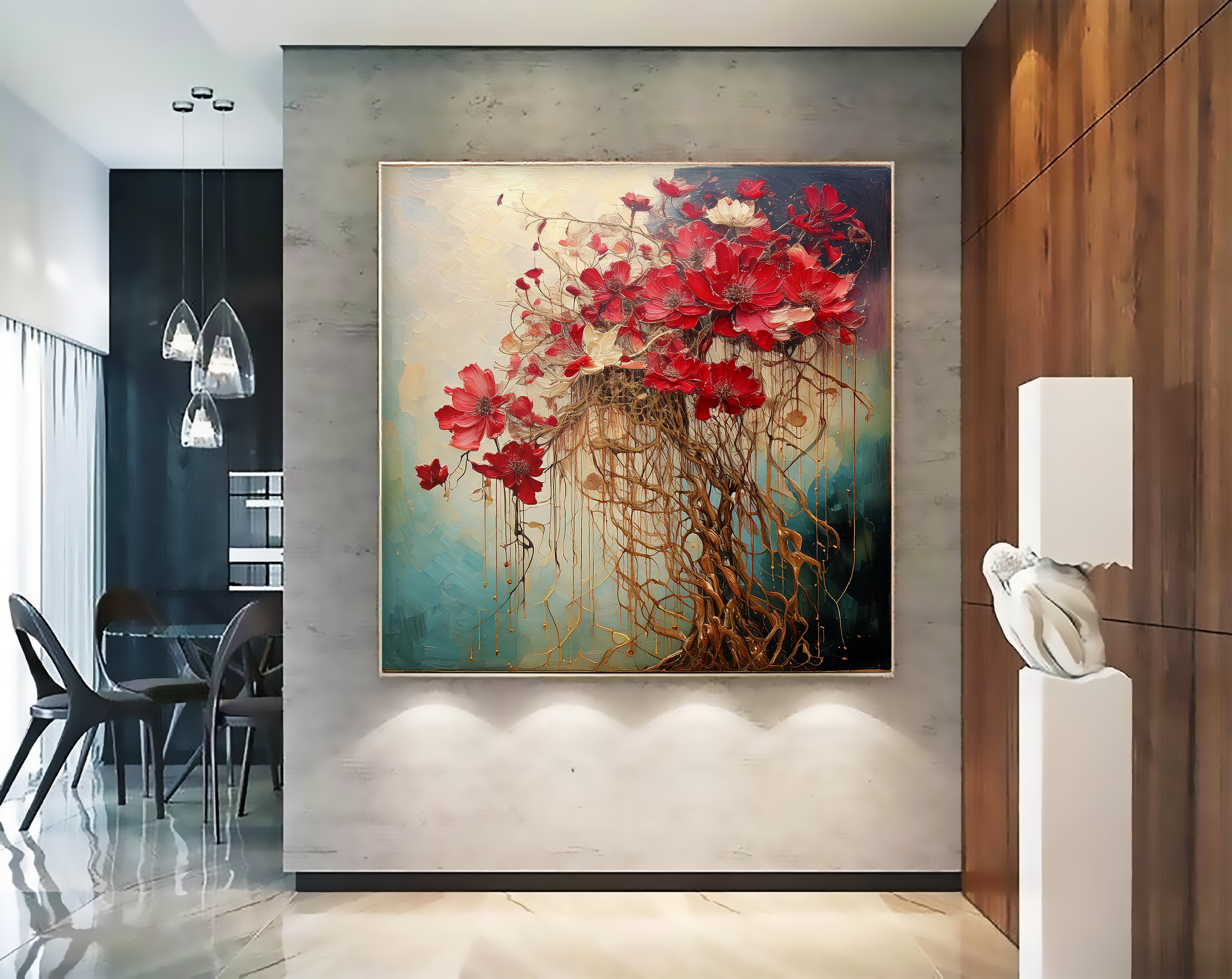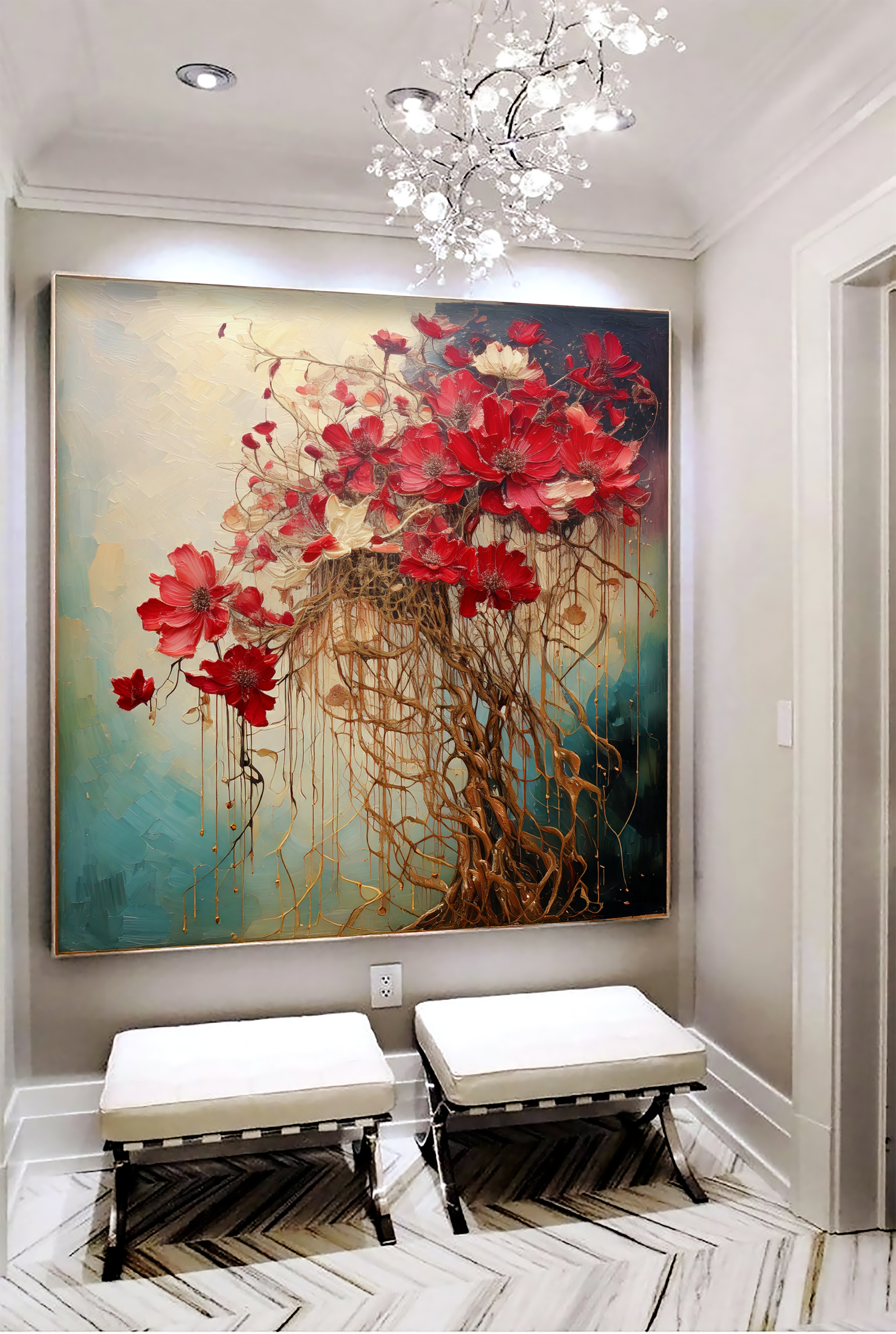 Step into an enchanting world where nature and emotion intertwine with “Whispers of Scarlet Roots,” a breathtaking original oil painting that captures the raw elegance of blooming vitality. This exquisite piece features cascading crimson and ivory flowers, delicately woven into an intricate network of golden roots. Suspended between air and earth, the blossoms appear to float, offering a sense of upward motion and quiet mystery.